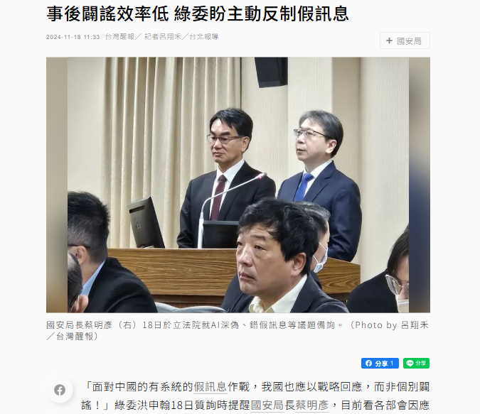 綠委洪申翰日前質詢國安局時提到政府部門因應錯假訊息應主動出擊而非停留在事後闢謠;國安局則回應國安團隊有因應機制、會跨部會回應。